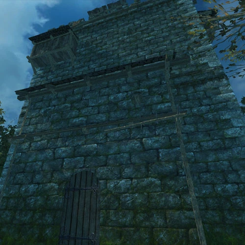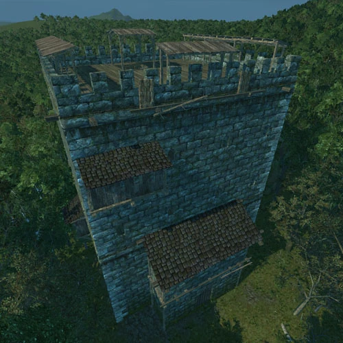 Ein Kleiner Bergfried ist der zweite Bergfried, den man bauen kann. Er ist sehr viel stabiler als sein Vorgänger, weil er Steinwände hat, aber dafür benötigt er sehr viel Material. Er bietet 40 Bindungsplätze. Es gibt einen Unterscheid zwischen Bindungsplätzen und Schlafplätzen in Häusern. Beim Bergfried oder Belagerungszelt startet man nur neu, wenn man während der "Stunde der Abrechnung" stirbt und dort gebunden war. Der Malus nach dem Tod beträgt hier auch nur 5 Minuten und nicht 10, wie bei einem Wohnhaus.