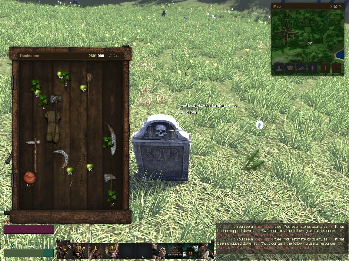 A Tombstone is placed wherever you die. You can go to it and collect the items you lost upon death. Tip: Make sure you know where you died, so you can find your belongings in time (tombstones are automatically claimed by you for 2 hours). Looting a tombstone belonging to someone else will result in a loss of 3 Alignment.